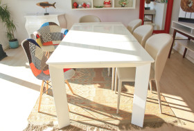 TAVOLO ALLUNGABILE in vetro bianco e alluminio.